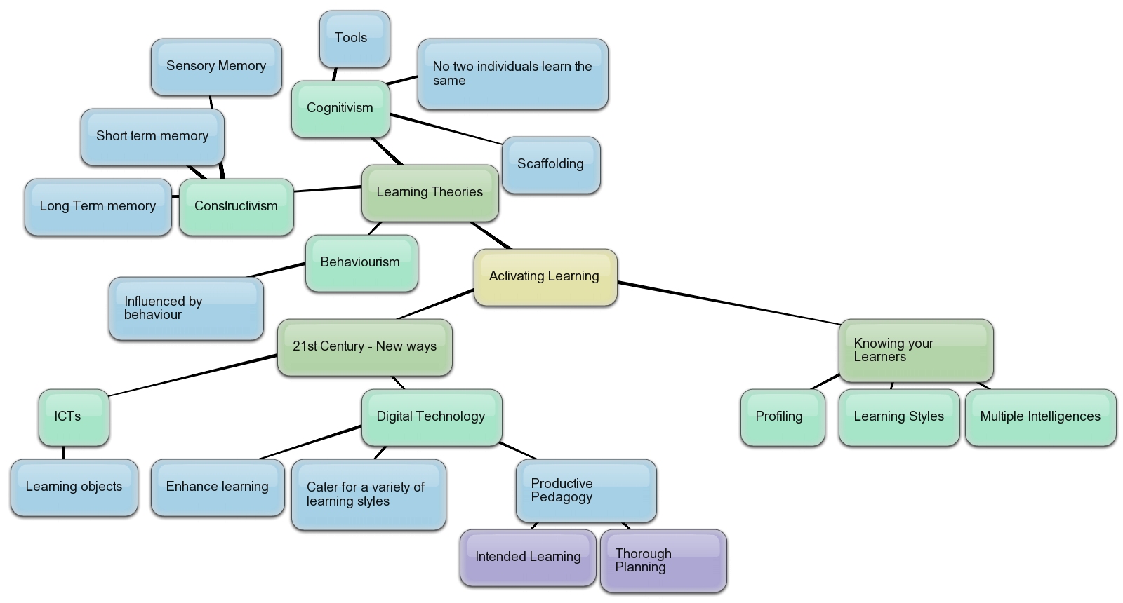One tool I explored in particular was the use of concept maps. A concept map can be considered helpful when it is used as a tool for organising information. It allows a learner to sort new information using a visual representation and it is able to be personalised for each individual's differing needs. Alongside this, by allowing a user to sort their information, it can be a way of linking with prior knowledge, or even storing information into a long term memory bank. The benefits of using a tool like this is that it can be used to support cognitivism and the mental processing of new information.